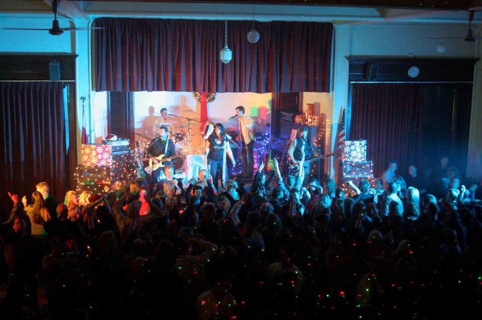 We got to the rented hall, turned in our tickets, had our hands stamped and were given a red Solo cup for pop or keg beer. My brother-in-law said it reminded him of a college kegger, and the atmosphere was equally festive. There were ugly Christmas sweaters, sequins, Santa hats and light-up jewelry. The security staff was very friendly, and everyone was filled with holiday spirit—as well as spirits of another kind (in addition to the beer and pop, people could also bring in their beverage of choice). However, all of the tables and chairs were already full of partygoers who had arrived early enough to grab a space.