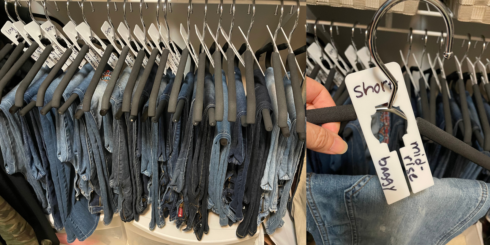 That led me to my *new* labeling system for denim. I bought a pack of plastic size disks ($9.99 for 30 on Amazon) and labeled them by rise, length and style. Voila! I now can grab a pair and know exactly how they will fit, saving me time and irritation. (In retrospect, I could have done this with cardboard tags as well, which would have been a bit more environmentally friendly.)