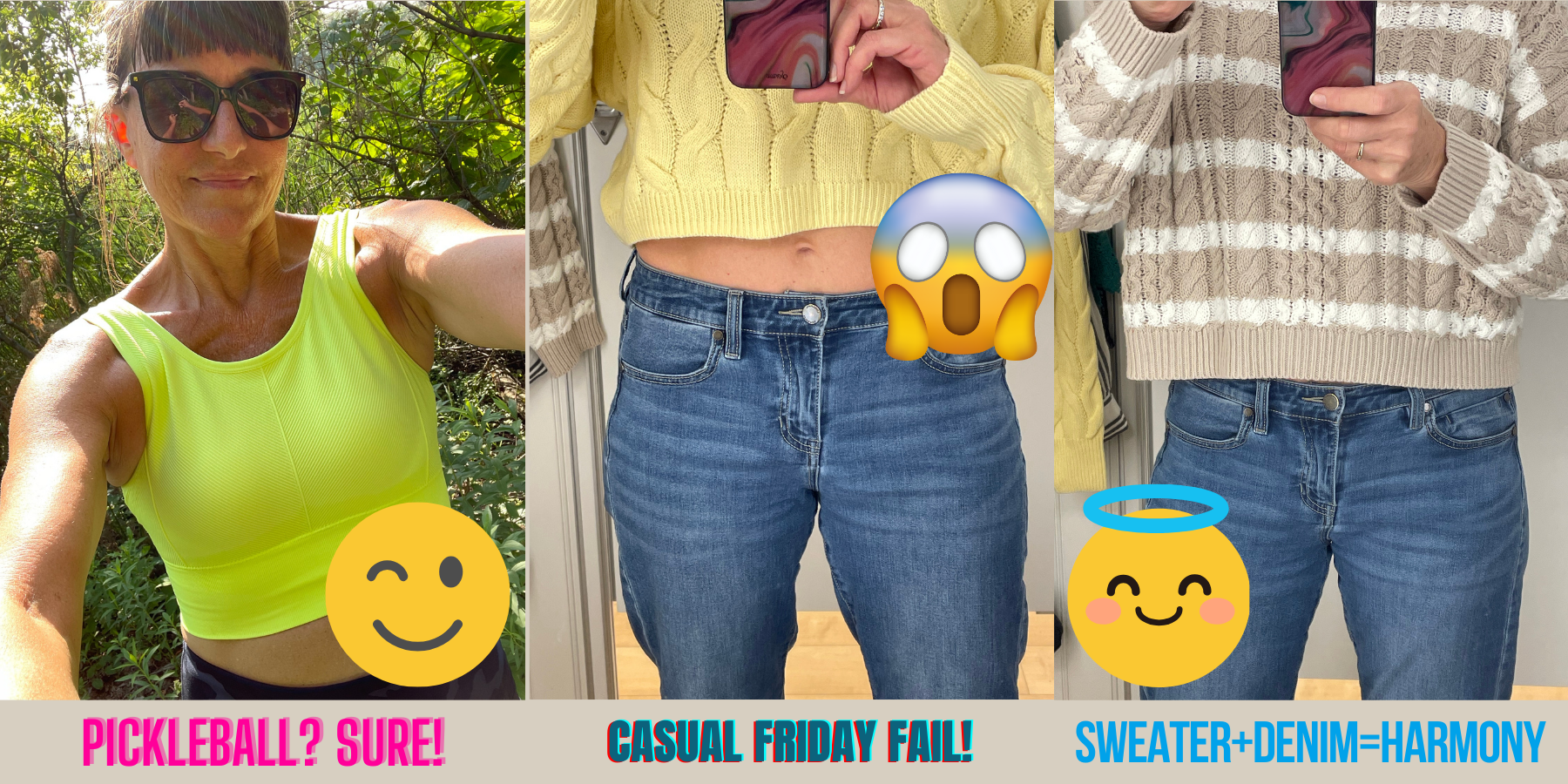 Crop tops are definitely one of those styles that are tricky to manage if you’re older than 30 or have given birth—and the last couple of years it’s been nearly impossible to find tops that are both cute and work appropriate. So, if I’m wearing a shirt that is slightly cropped, I will pair it with mid- or high-rise jeans to compensate, keeping my bellybutton covered. Likewise, if I’m wearing a longer, tunic-style top, I want to pair that with minimal bulk around my waist. Yet I couldn’t always tell, by glancing at a pair, which jeans would work. Finding the right bottoms to wear with a specific top frustrated me, because—invariably—I would end up trying on several pairs each time, in search of the right fit.